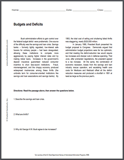 Budgets And Deficits Reading With Questions Student Handouts Food Label Reading Worksheet