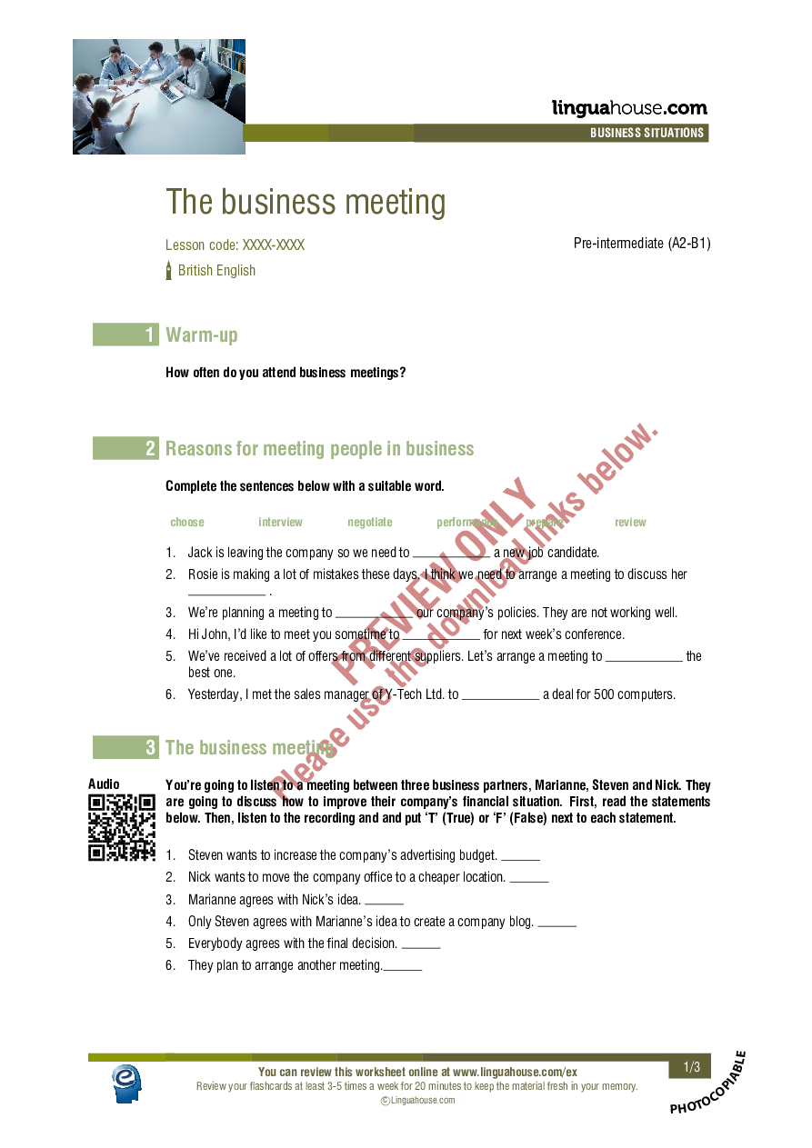 The Business Meeting Worksheet Preview Linguahouse Com Multiplication In Arrays Worksheet