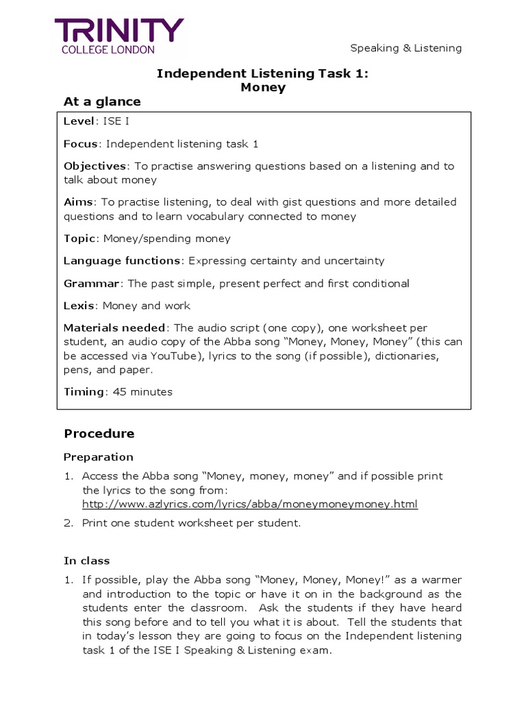 Ise I Independent Listening Task 1 Ca1 Money Test Assessment Cognition Web Design Worksheet