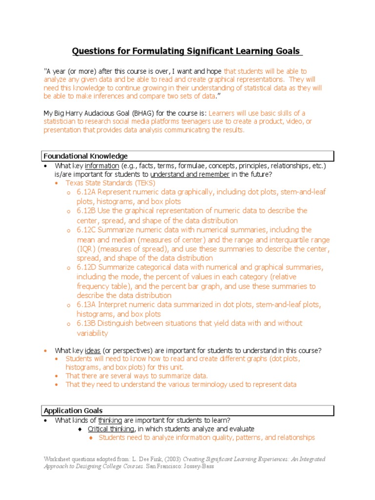 Worksheet 2 Questions For Formulating Significant Learning Goals Data Histogram Free 30 Day Trial Scribd Worksheet Art Year 2