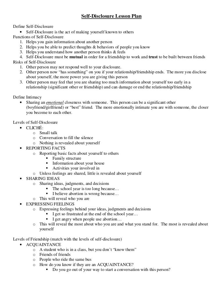 Self Disclosure Lesson Plan Worksheet Template For Students